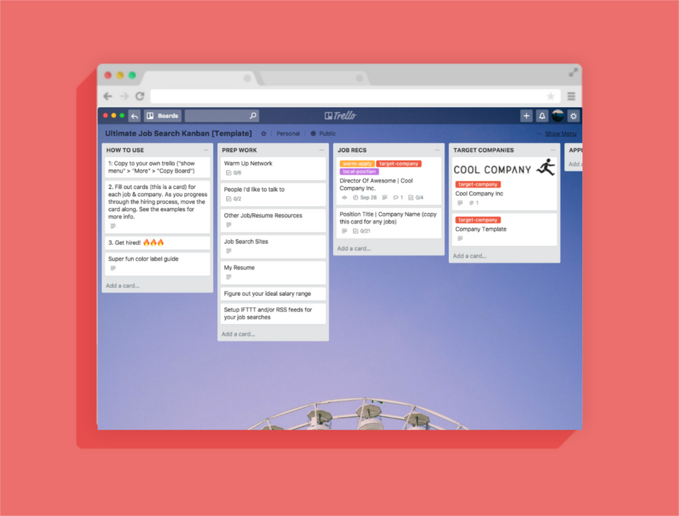 Being a hyper nerd about digital organization, I spent countless hours compiling all the best resources for my job search. And after trying job application tracking software like huntr I decided I wanted a more custom solution. So I went back to trusty Trello for maximum customization.I transformed my own job searching board into this template for your use.